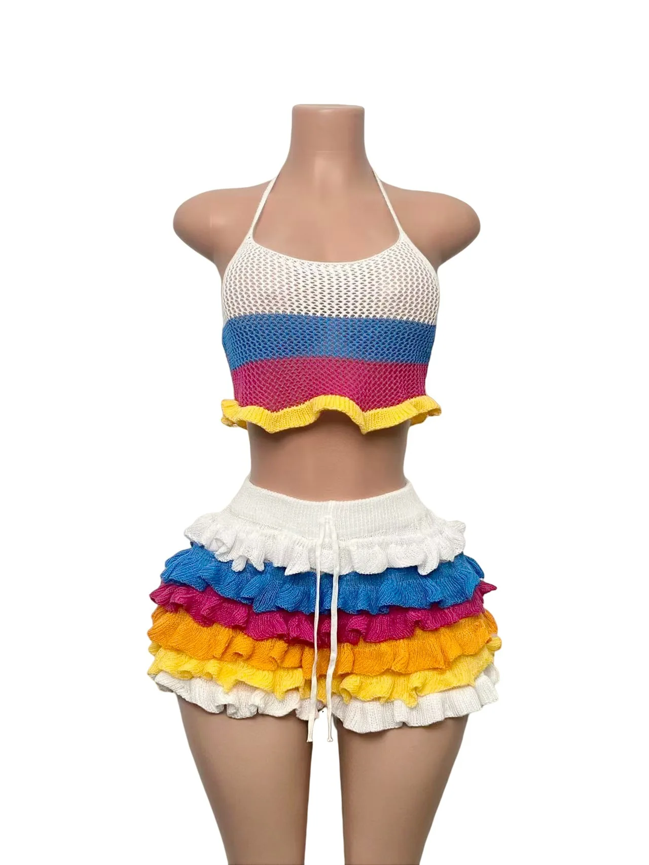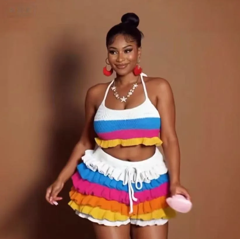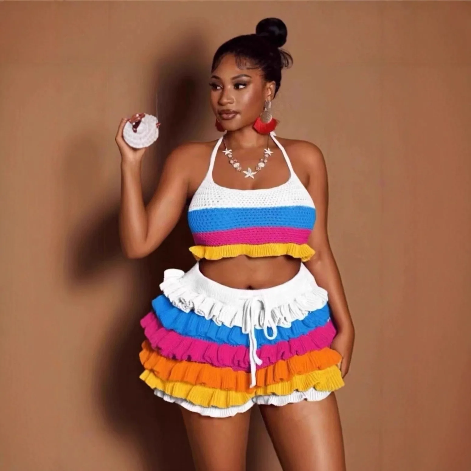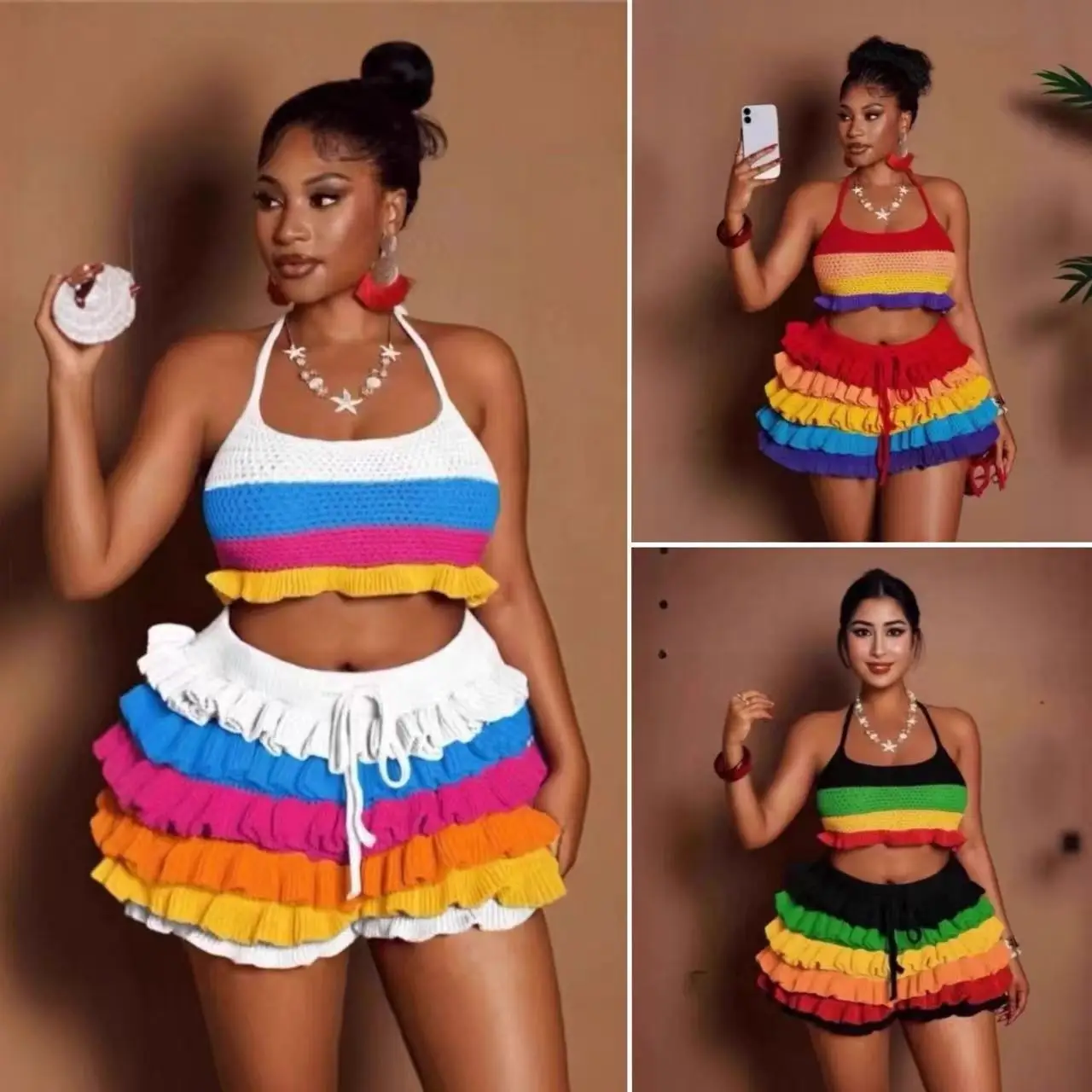A vibrant, head-turning two-piece set designed for sunny days and stylish nights. This matching ensemble features a sexy halter-neck top in colorful striped knit fabric paired with playful ruffled shorts, creating a coordinated look that's both fun and fashion-forward.