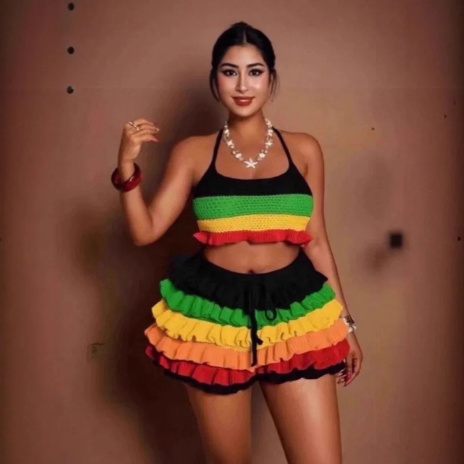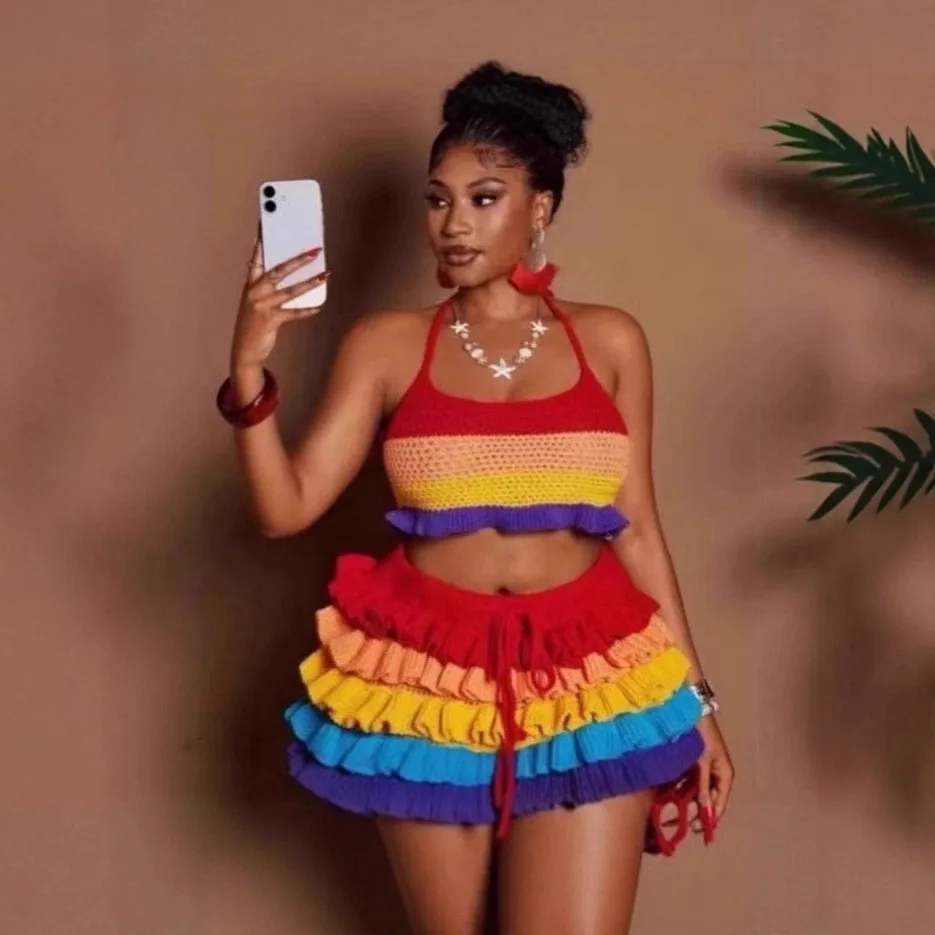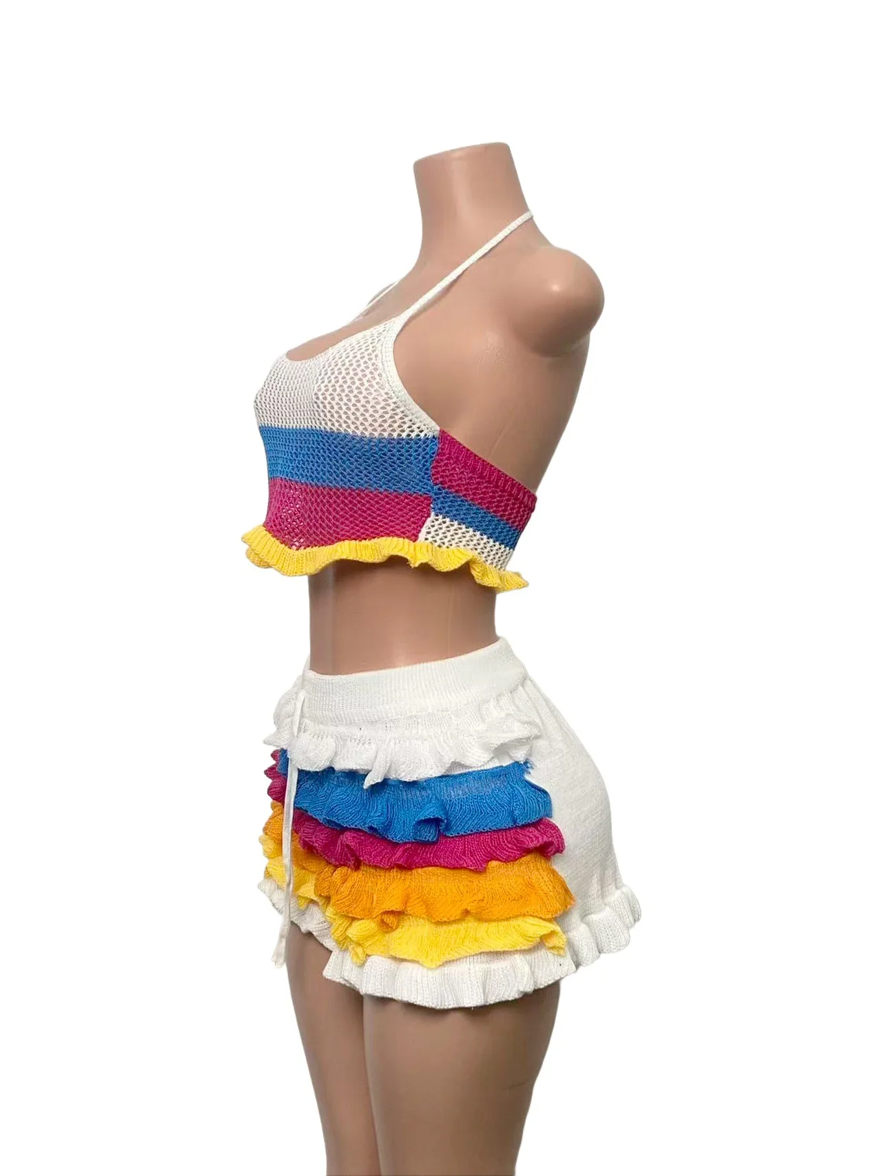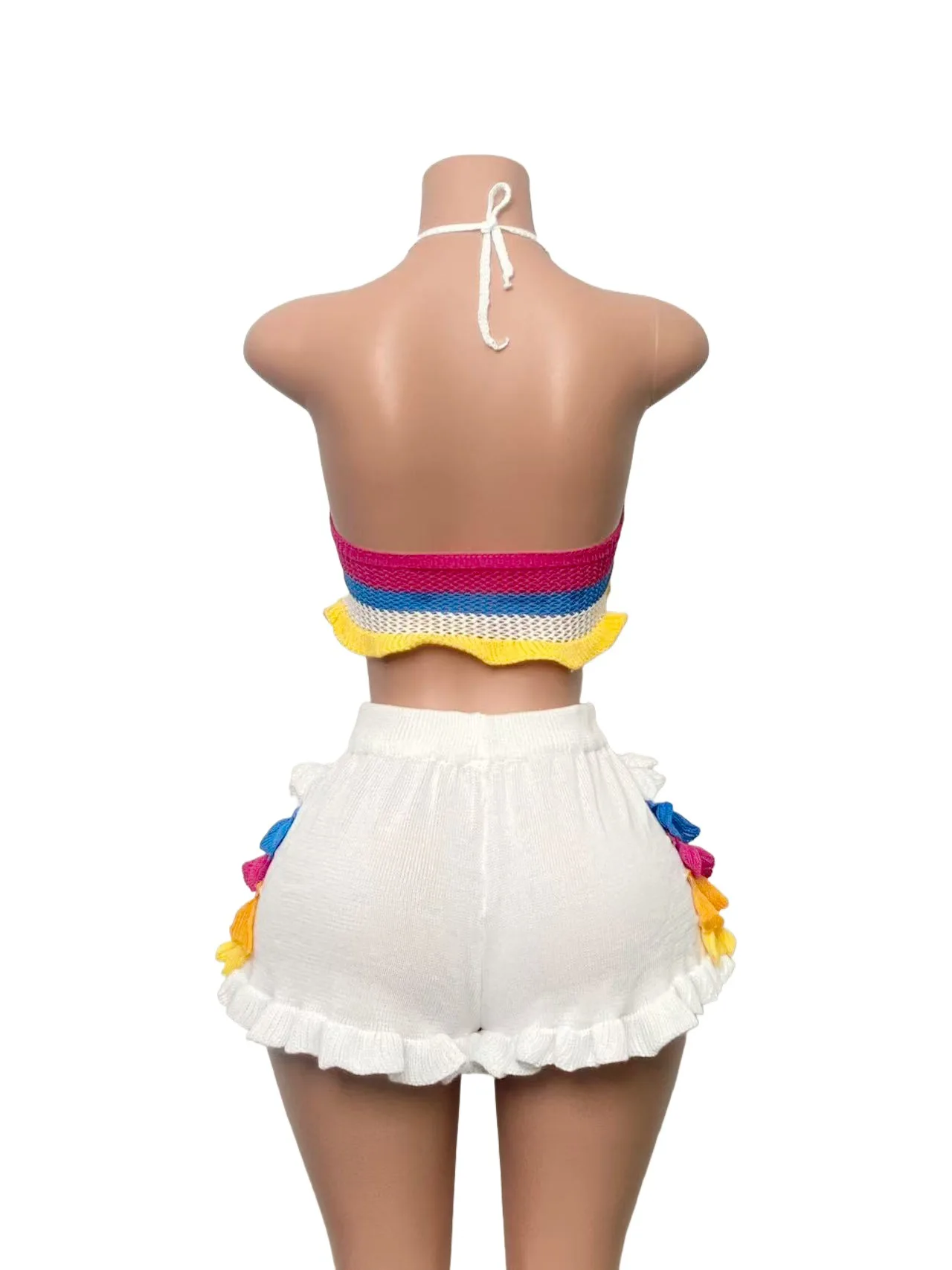 A vibrant, head-turning two-piece set designed for sunny days and stylish nights. This matching ensemble features a sexy halter-neck top in colorful striped knit fabric paired with playful ruffled shorts, creating a coordinated look that's both fun and fashion-forward.