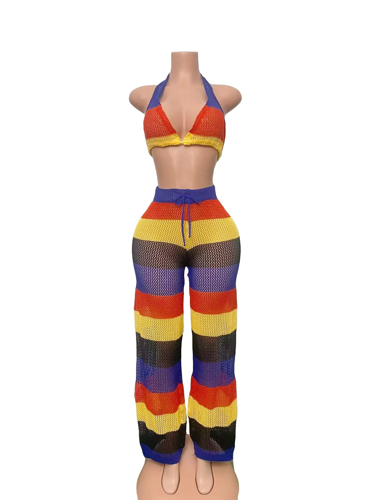A bold, head-turning two-piece ensemble that combines retro charm with modern sensuality. This coordinated set features a sexy halter-neck crop top in vibrant multicolor stripes, paired with flowing wide-leg pants crafted from lightweight, semi-sheer fabric for a fashion-forward, vacation-ready look.