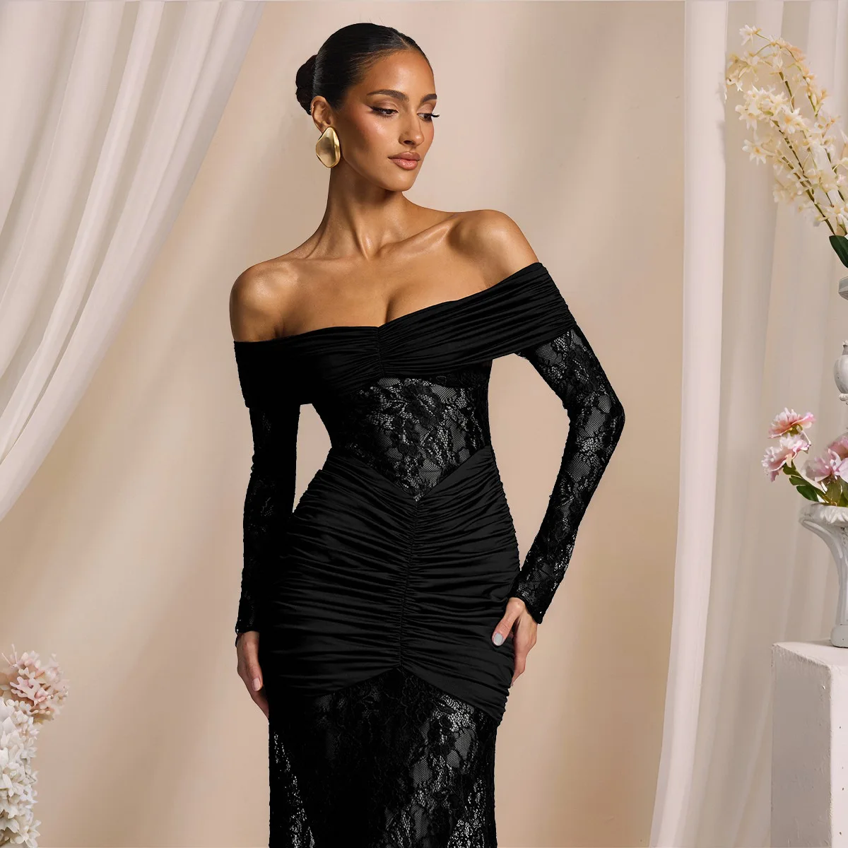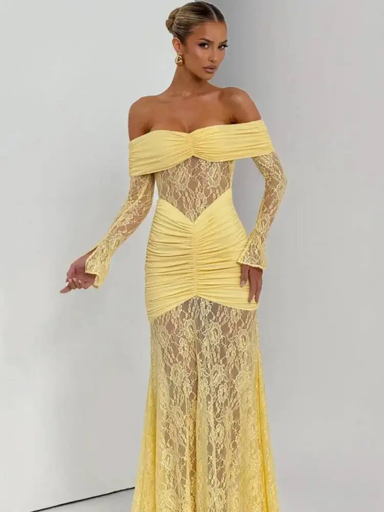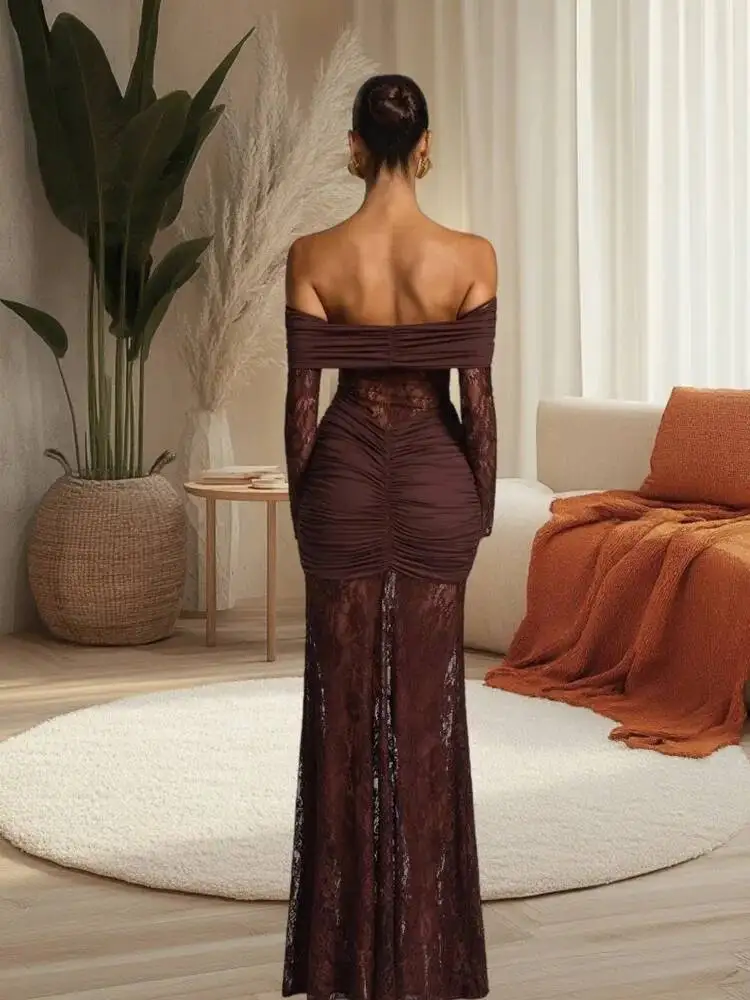 A breathtaking evening gown designed for unforgettable nights. This stunning off-shoulder dress features delicate hollow-out lace, dramatic flare sleeves, and a curve-hugging mermaid silhouette—perfect for autumn galas, club events, and formal parties.