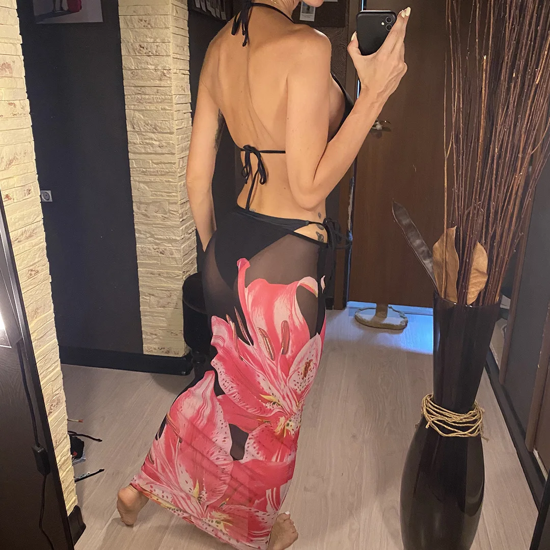 A complete, feminine swim ensemble designed for style and versatility. This three-piece set includes a floral-print bikini top, matching bottom, and a coordinating skirt cover-up, offering multiple styling options for beach days, poolside lounging, and tropical getaways.